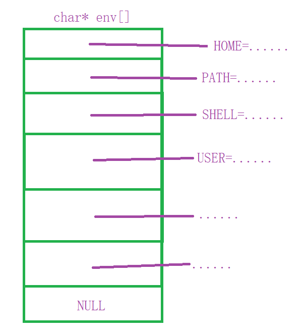 环境变量以字符指针数组的形式存储,每个指针指向一个以\0结尾的字符串(格式为键=值),数组最后一个元素为NULL,即环境变量表,结构如下: