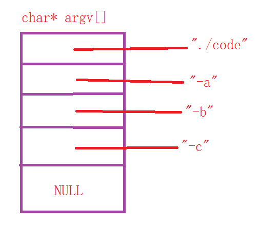 ./code -a -b -c,那么命令行参数表大致如下: