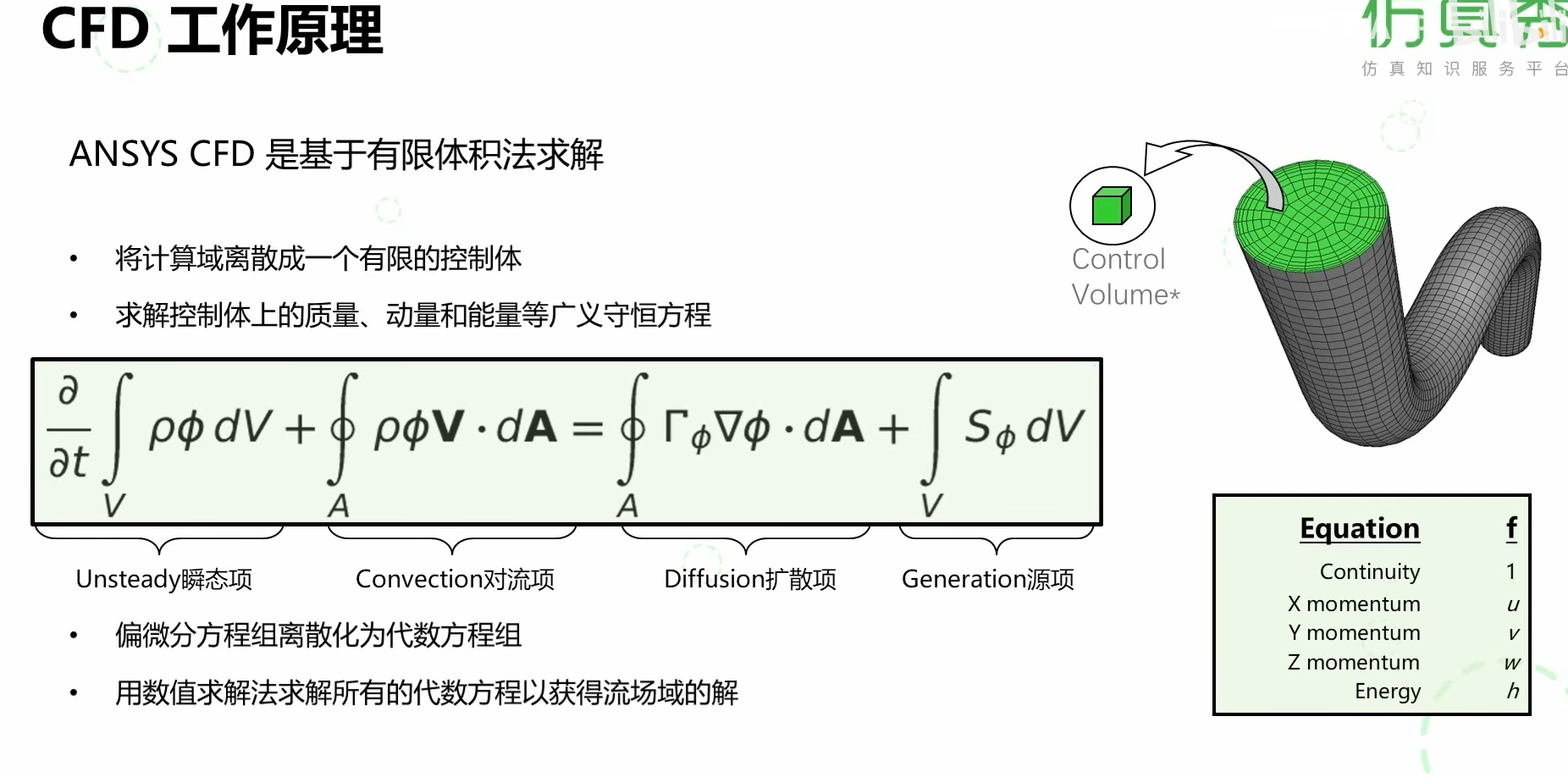 阐述了CFD(计算流体动力学)基于有限体积法的工作机制。核心流程分为四步:将连续计算域离散化为有限控制体;在各控制体上建立质量、动量、能量的广义守恒方程(通用形式为 ∂(ρφ)/∂t + ∇·(ρvφ) = ∇·(Γ∇φ) + S,其中φ为通用变量);将偏微分方程组离散化为代数方程组;最后数值求解代数方程组获得流场解。右侧补充了守恒方程中物理量φ的具体含义:连续性方程为1,动量方程对应速度分量u、v、w,能量方程对应焓h。控制体示意图直观展示了离散化概念,整体呈现了从物理问题到数值解的全链路逻辑。
