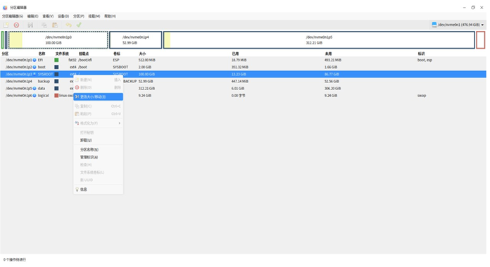 删除/backup分区后,右击根分区,点击更改大小,将/backup分区删除