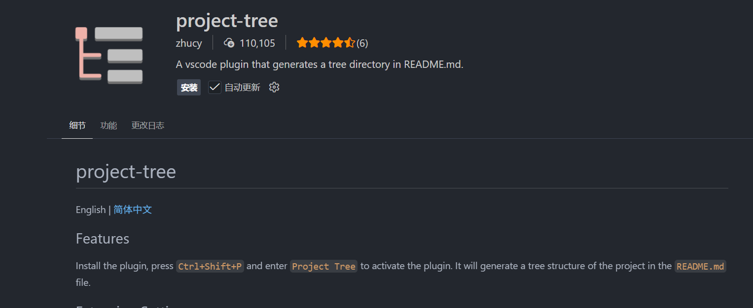 此外还有一些类似的拓展,比如 projecct-tree,这个拓展支持生成 Markdown 格式的项目目录,在某些场景使用起来更加方便。