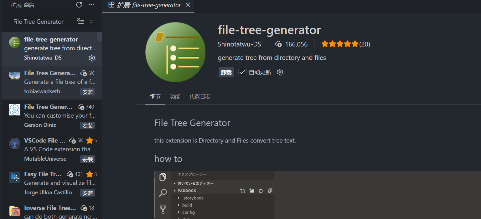 ①在 VS Code 拓展中搜索 file-tree-generator,下载该拓展。