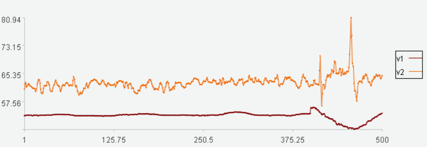 图中v2是阀门开度,v1是流量,红框中两者的关系发生变化,阀门开度增大,流量却在减小,异常了。