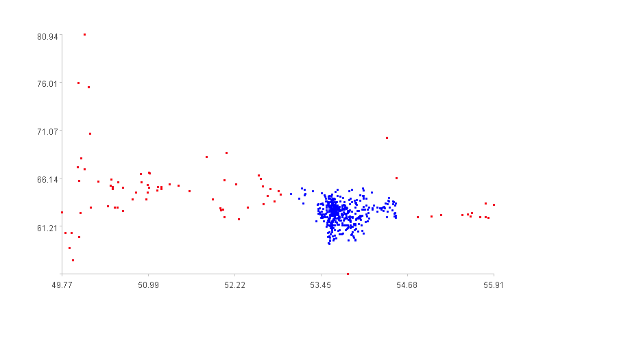 如果把异常程度大于0的数据作为异常点,散点图中的异常情况如下: