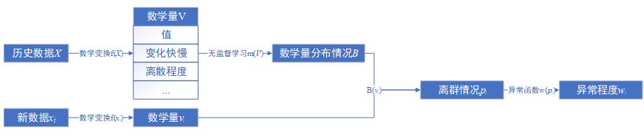 寻找某个数学量,并用历史数据计算该数学量的分布,新数据相对于历史分布的离群程度,就可以用来表征异常程度。