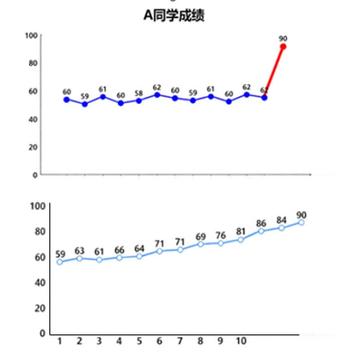 举个容易理解的例子:A同学平时考60分,有一天突然考了90分,大家一定认为该同学的分数异常了。