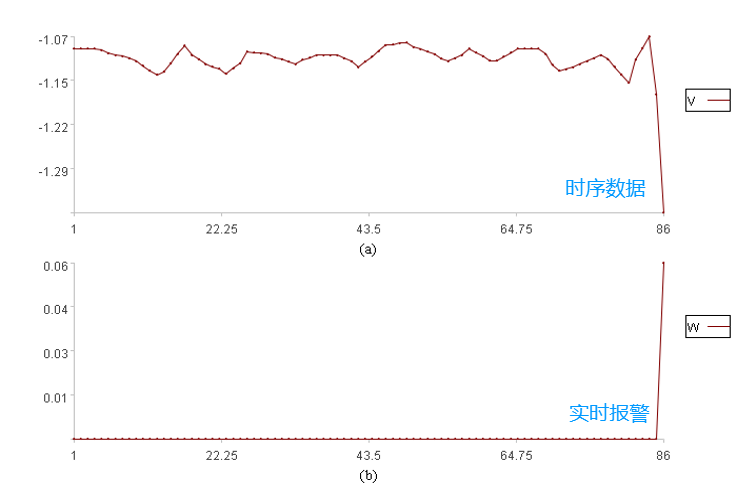 及时要求时效性高,最好是采集到数据的第一时间就能判断该数据是否异常,比如下图中的第86个点,刚采集到就给出了实时报警。