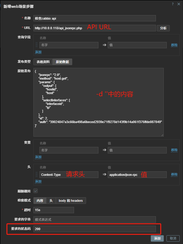 - 区别在于添加api接口的时候不能只看状态码,应该看返回结果的内容,这里过滤Zabbix Server