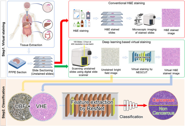 图1 使用数字切片扫描仪进行基于深度学习的人体组织VHE染色和分类概述。步骤1:从提取的器官中制备福尔马林固定石蜡包埋(FFPE)组织切片。在传统工作流程(红色路径)中,玻片用H&E化学染色。在基于深度学习的工作流程(绿色路径)中,通过数字切片扫描仪获取未染色明场(UBF)图像,并使用NEGCUT模型(用于无配对图像到图像转换中对比学习的实例级硬负样本生成)进行虚拟染色,以生成虚拟H&E(VHE)图像。步骤2:UBF和相应的VHE图像通过双ResNet-18编码器处理,提取的特征被压缩、融合,并使用全连接网络分类为癌性和非癌性类别。该框架提供了传统H&E染色的高通量、无标记替代方案。由BioRender创建。