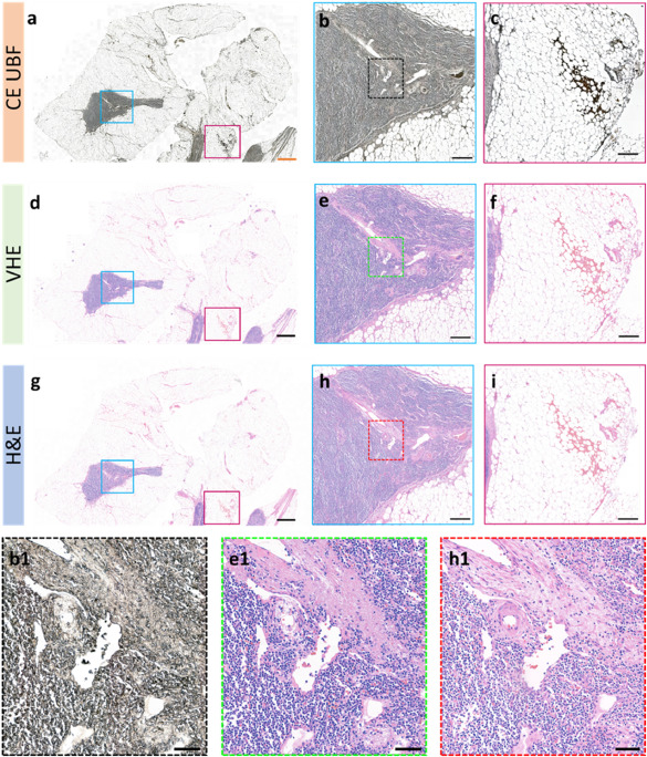 图3 人体淋巴结组织切片对比增强未染色明场图像、UBF的VHE图像和H&E染色切片之间的视觉比较。a-c 对比增强未染色明场(CE-UBF)图像;d-f 相应的虚拟H&E染色(VHE)图像,比例尺为1毫米;g-i 相同人体淋巴结组织切片的相应真实组织化学H&E染色图像。a、d和g显示全视野图像,比例尺为1毫米。b、e和h分别显示a、d和g中蓝色高亮区域的放大区域,比例尺为200微米。c、f和i分别显示a、d和g中粉色高亮区域的放大区域,比例尺也为200微米。b、e和h的进一步放大区域分别显示在b1、e1和h1中,着重于详细的细胞形态比较,比例尺为50微米。