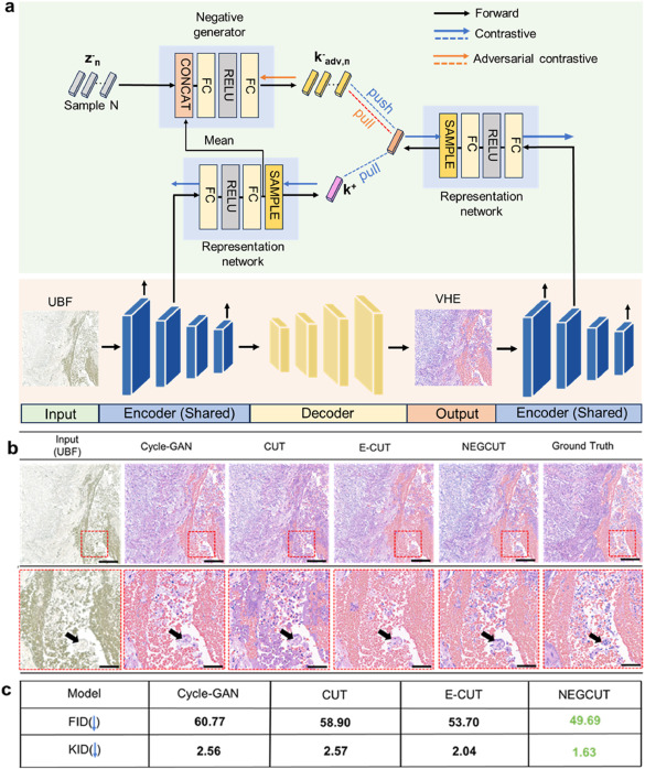 图2 NEGCUT模型整体架构及结果。a NEGCUT模型(修改自Wang等人(Wang et al., 2021))的示意图,用于将未染色明场(UBF)图像转换为虚拟H&E染色(VHE)图像。b CycleGAN、CUT、E-CUT和NEGCUT模型的UBF输入和VHE输出与相应H&E染色图像的视觉比较,使用来自人脑组织的真实样本。比例尺:200微米。每个图像下方显示放大区域,比例尺:50微米。黑色箭头指向代表性细胞核,表示不同网络感知的形态细节差异。c 通过应用Fréchet Inception Distance(FID)和Kernel Inception Distance(KID)指标对图(b)所示模型的虚拟染色性能进行定量评估。较低的FID和KID分数反映了与真实情况更接近的相似性。
