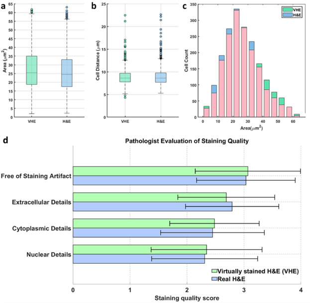 图4 VHE染色图像与H&E图像的定量分析和病理学家评估。a 核横截面积的箱线图显示VHE与真实H&E图像之间具有极好的一致性。b 细胞间距离的箱线图比较显示两种模态下细胞核间距规则。c 核面积分布直方图证实VHE和H&E图像具有相似的细胞大小分布。d 三位经董事会认证的病理学家在四个类别(细胞核细节、细胞质细节、细胞外细节和无染色伪影)上进行盲评,采用4分制(1 = 差,2 = 一般,3 = 好,4 = 优秀)。VHE图像被评定为接近真实H&E,在无染色伪影方面略高。