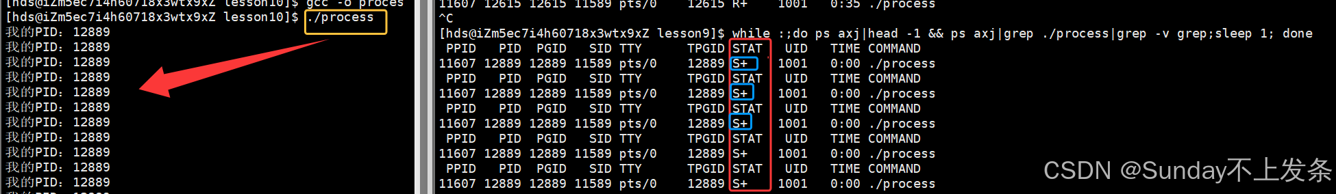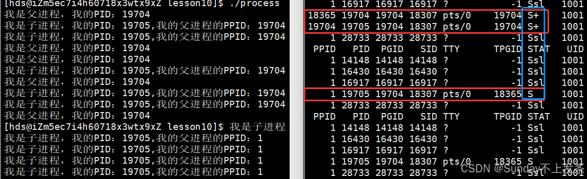 当父进程结束后,子进程由S+状态变为S状态,即由前台进程变为后台进程。同时,该进程(孤儿进程)的PPID变为 1,说明此时子进程被 PID为 1 的进程管理(领养)。