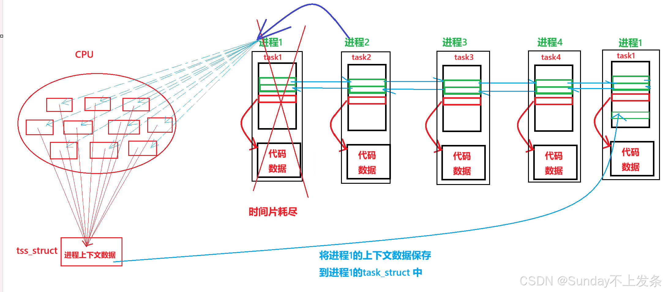 CPU上其实有很多寄存器,当进程在CPU运行时,就会将自己的数据存储在CPU的寄存器里面,当该进程时间片耗尽,但进程还不能结束时,肯定不能直接让操作系统把该进程剥离下来放到运行队列最后,在操作系统将进程剥离下来之前,会将该进程在寄存器上的数据记录一份在一个专门记录寄存器上数据的结构体中(struct tss_struct),而该进程的 task_struct 中就有一个tss_struct* 的指针,操作系统会让该指针指向这份数据,当下一次轮到该进程运行时,就会根据 task_struct 中记录进程状态的参数判断:该进程是第一次占有CPU还是被切换下来的进程,如果是被切换过的,就会将 tss_struct 结构体中的数据拷贝(恢复)到CPU的寄存器里,继续接着运行。