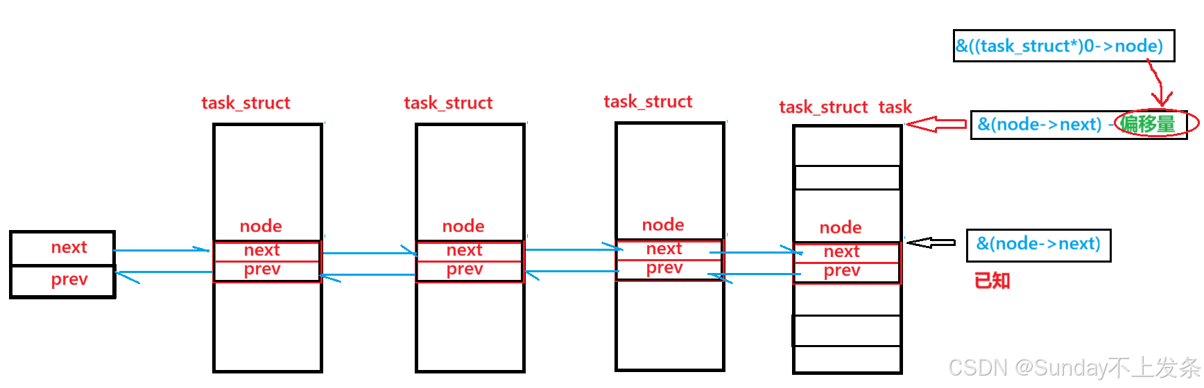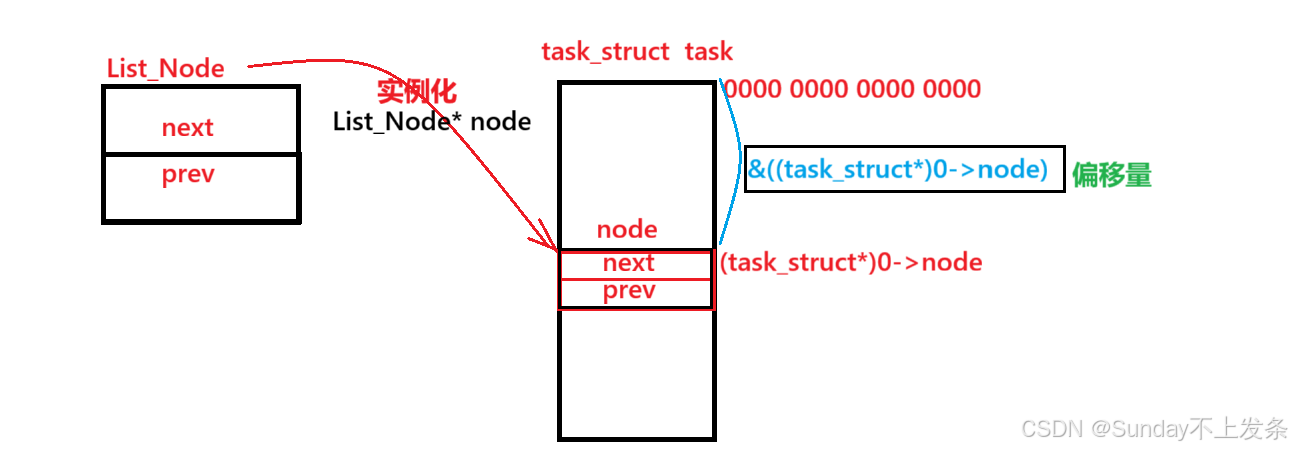 计算偏移量可以将 0 强转为 task_struct* 类型,然后找到task对象的node成员,由于task对象起始地址为0,则node的地址即为偏移量(node的地址:&((task_struct*) -> node))。