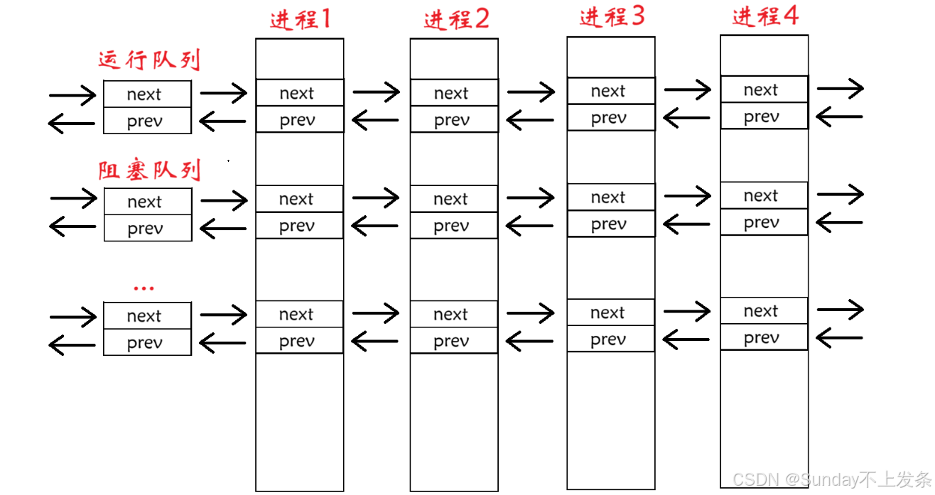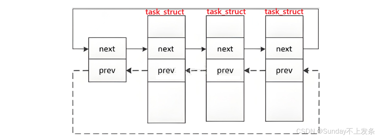 Linux底层用创建了一个结构体(假设为List_Node),且这个结构体中的有两个 struct List_Node*类型的指针 next 和 prev。List_Node结构体对象也是task_struct中的成员,然后通过 next 和 prev 将进程链接为双向链表。