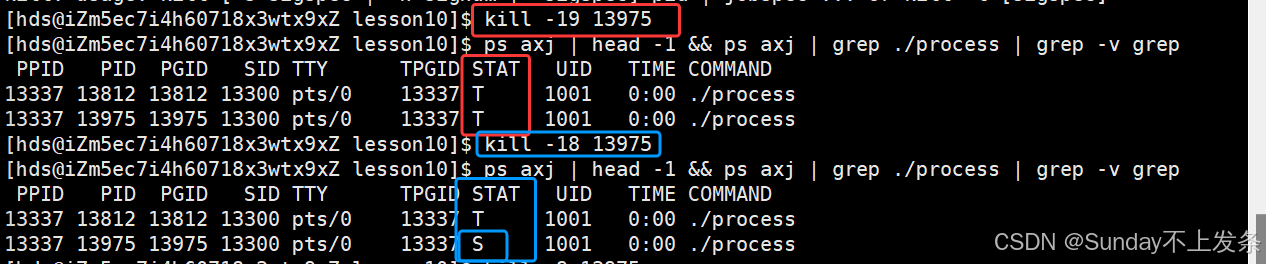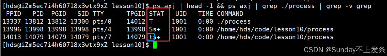 T停止状态(stopped): 可以通过发送 SIGSTOP 信号给进程来停止(T)进程。这个被暂停的进程可以通过发送 SIGCONT 信号让进程继续运行。
