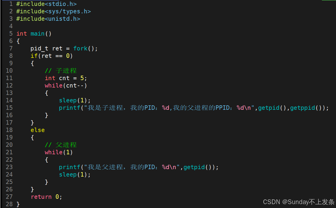 通过 man fork 查手册可知,fork 头文件为#include<unistd.h>,最重要的是:fork 有两个返回值。
