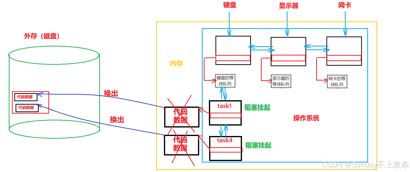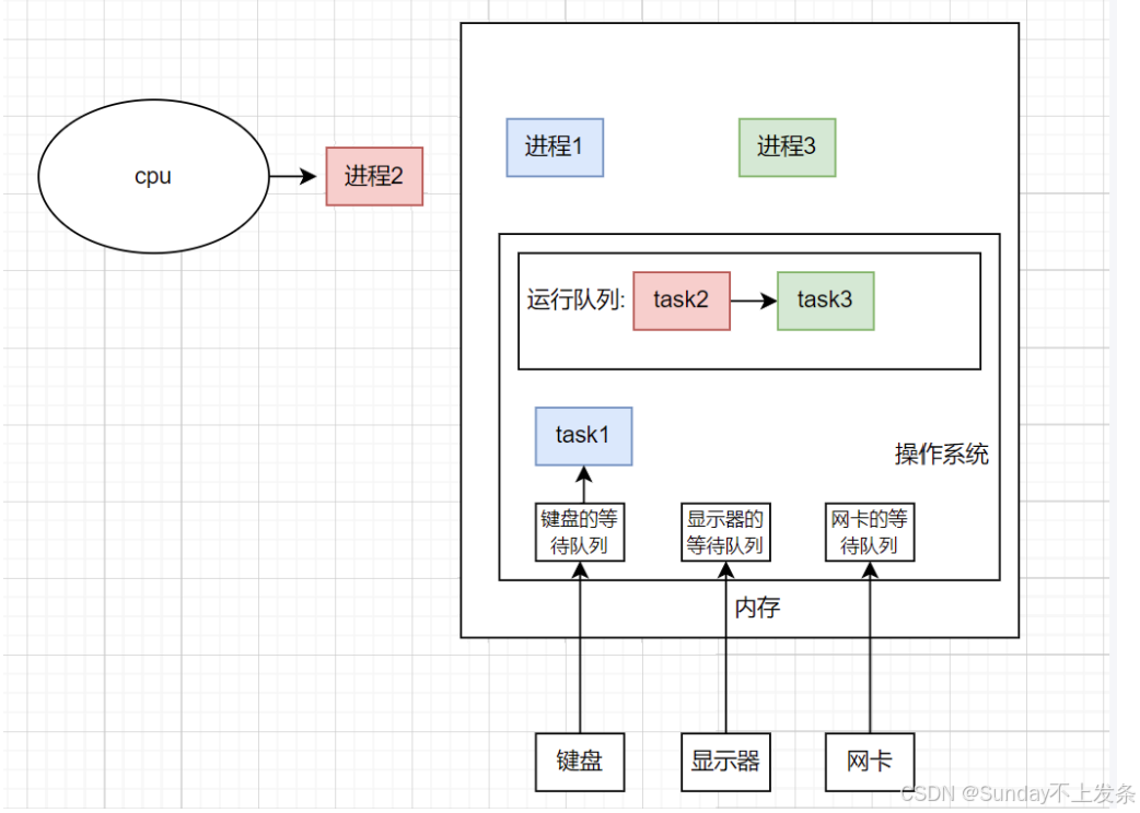 比如在银行存储数据时,来了一个进程(让磁盘存储1000MB数据),此时该进程就会等待磁盘存储数据的结果(是否存储成功)同时进入阻塞队列(S)。