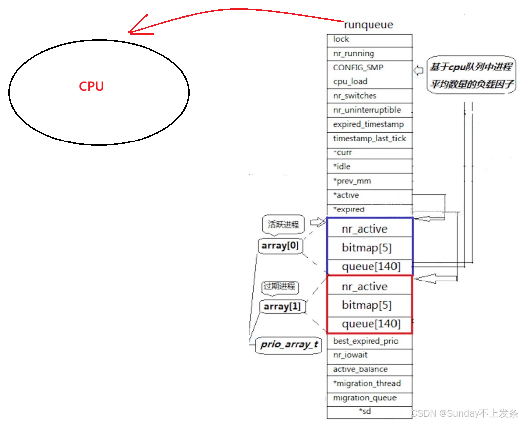 *active 指向的queue[140] 是活动队列,*expired指向的queue[140] 是过期队列。