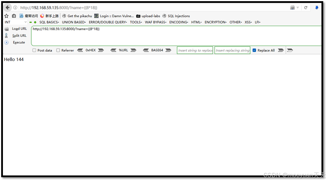 信息搜集的关键通常在 / 路由,通过 name 参数传入,注入Payload:?name={{8*18}},完整的URL地址如下所示。