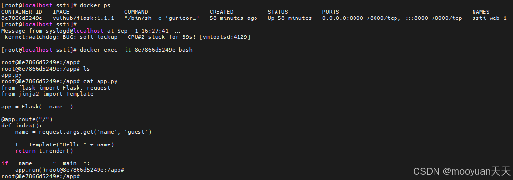 8e7866d5249e vulhub/flask:1.1.1 "/bin/sh -c 'gunicor..." 58 minutes ago Up 58 minutes 0.0.0.0:8000->8000/tcp, :::8000->8000/tcp ssti-web-1