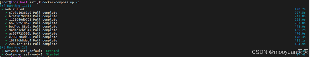 在Flask/ssti目录下,使用docker-compose up -d命令启动环境。Vulhub 的脚本会自动从 Docker Hub 拉取预先构建好的镜像并启动容器。