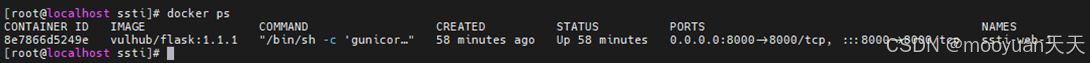 使用 docker ps 命令确认容器启动状态,说明由Vulhub 项目提供的ssti镜像),容器已正常运行 58 分钟,如下所示。