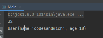 我们定义一个User类,并在main方法中创建一个user对象,名字是codesandwich,年龄是18岁: