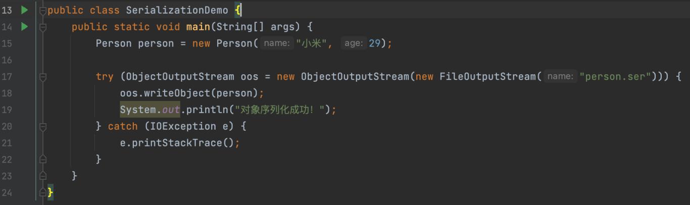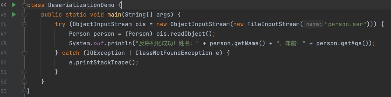 运行这个代码可以将 person.ser 文件反序列化为Person对象,并重新获得其属性值。