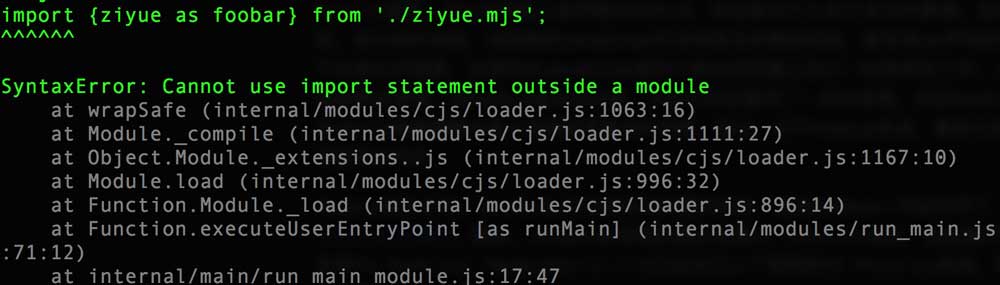 这里还有一点需要注意,我们命名 js 模块文件不是用 .js 扩展名,而是用 .mjs 扩展名。这是因为 Node.js 目前默认用CommonJS规范定义 .js 文件的模块,用ES Modules定义 .mjs 文件的模块。如果我们直接将index.mjs文件改成index.js,然后运行node index.js,控制台上将报告错误信息。