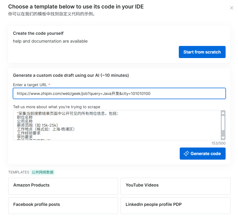 | 灵活性 | 有限(仅支持预设模板和字段) | ⭐⭐⭐⭐⭐(任意网站、任意字段、完全可控) | ⭐⭐⭐⭐(Prompt 驱动 + 可进入 IDE 手动优化) |