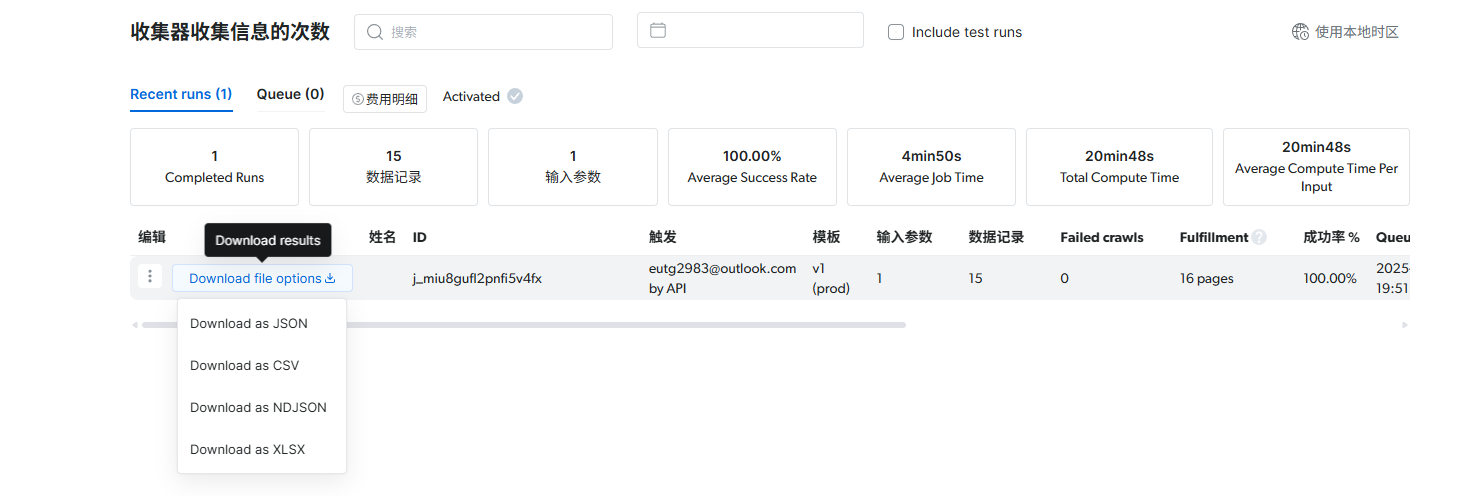 采集完成后,你可在 "Results" 标签页 下载数据,或通过 Webhook / API / 云存储(S3、GCS 等) 自动接收结果。