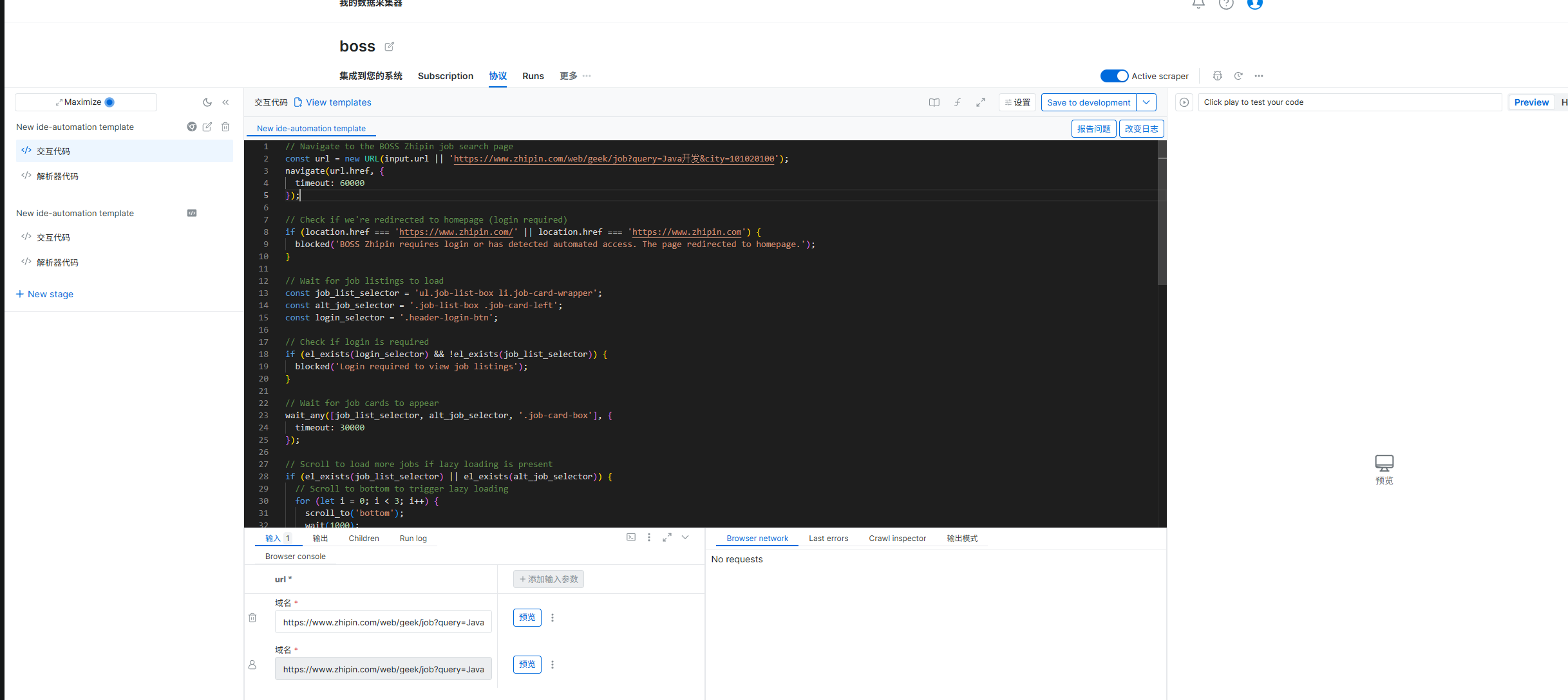 更关键的是:当BOSS直聘近期悄然改版,传统脚本全部失效时,用户只需进入内置IDE,可一键"Regenerate"自动修复,AI便自动分析新版页面结构,3分钟内重建有效提取逻辑,恢复高质量采集------覆盖阿里、华为、中软等头部企业,业务零中断。