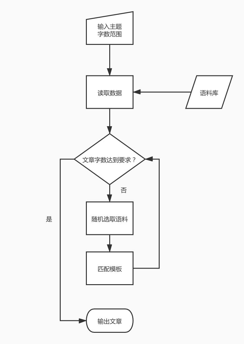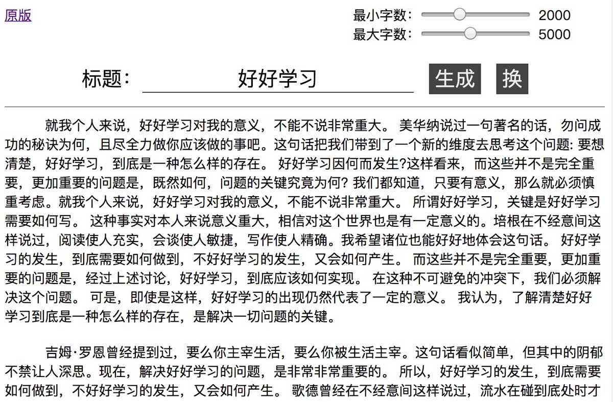 文章生成器的产品原型非常简单,就是用户设定主题和字数,应用根据内置的语料库,按照规则自动生成一篇随机的文章。