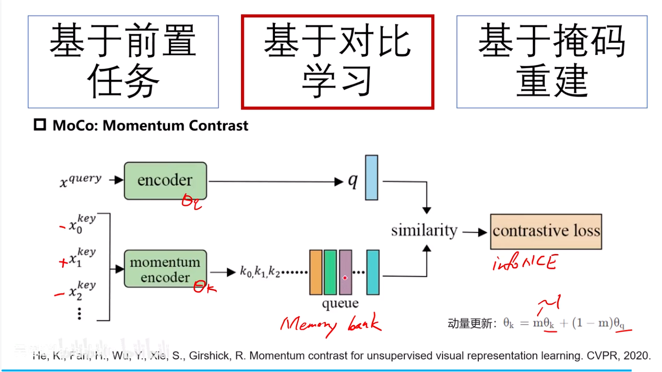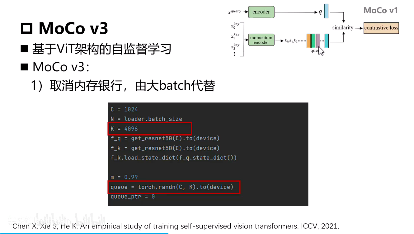 - 使用动量更新是为了保持键编码器参数的平稳变化,从而确保队列中负样本特征的一致性,避免快速变化的编码器导致对比学习目标的不稳定。
