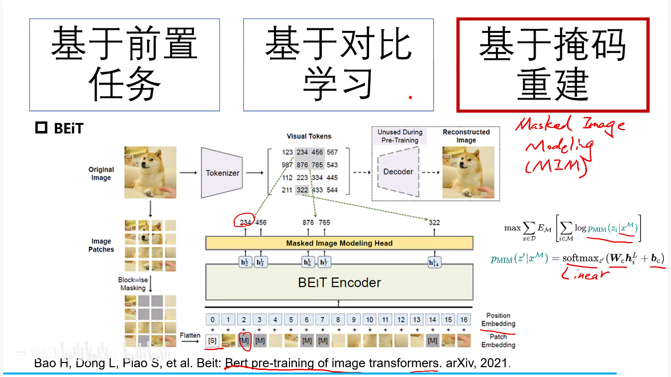 BEiT使用一个预训练好的图像Tokenizer,将每个图像块编码成一个离散的视觉令牌。模型的目标是预测被掩码图像块所对应的视觉令牌ID。