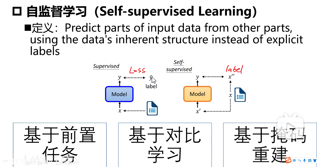 自监督学习:输入+模型+求损失(预测值,输入中找标签)