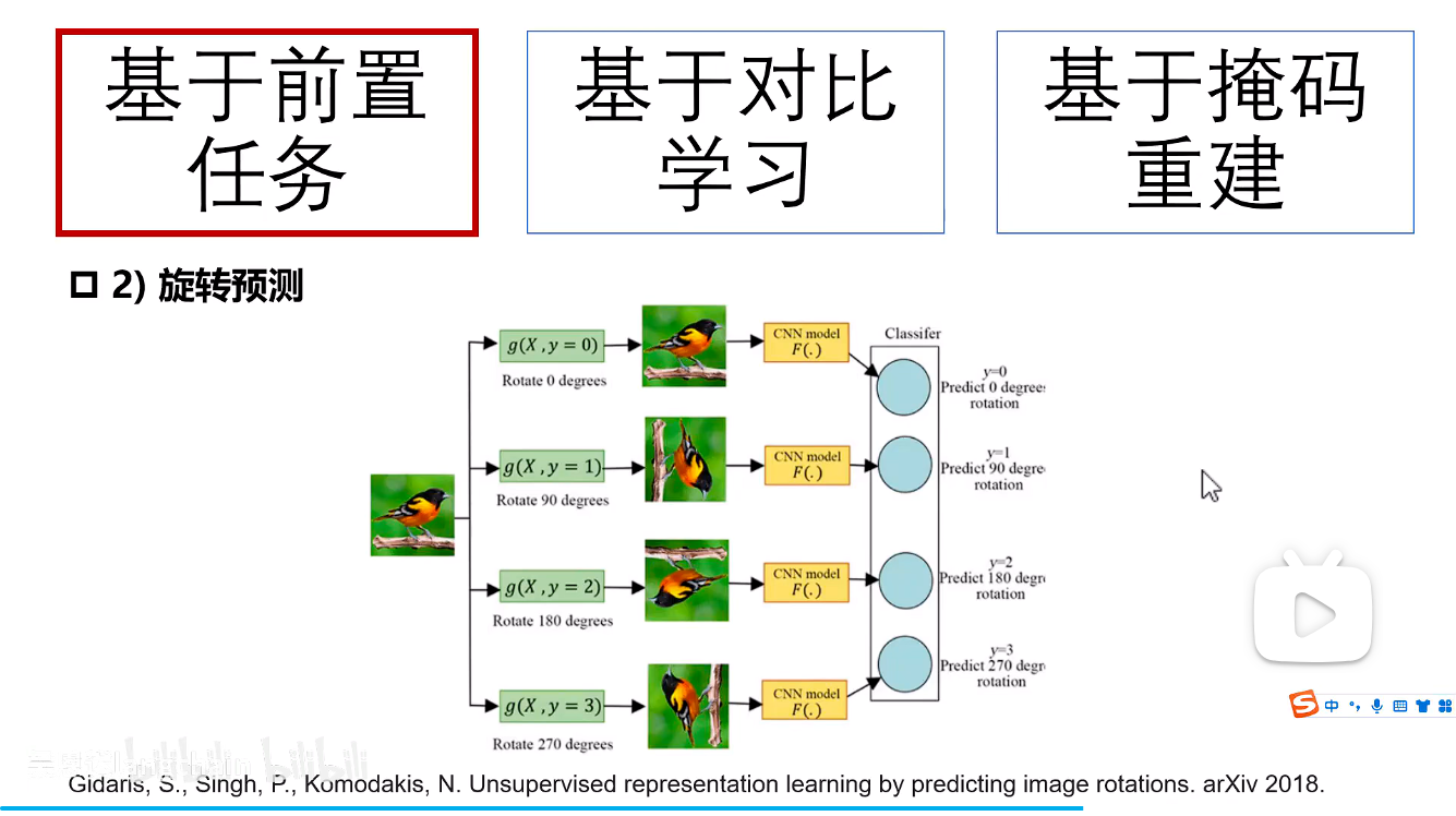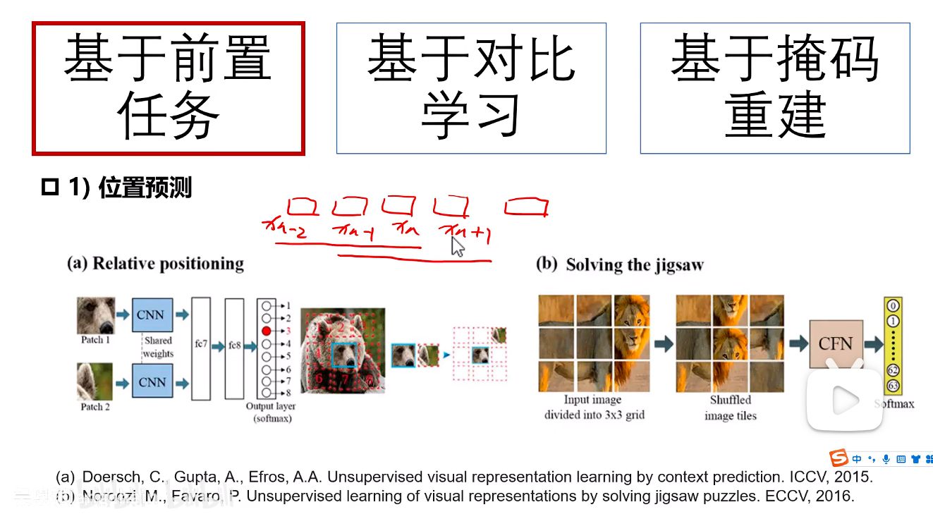 从一张图中取出一个补丁(Patch A),然后在其"八邻域"中取出另一个补丁(Patch B),让模型判断B相对于A的位置(例如:右上、正左、右下等)。