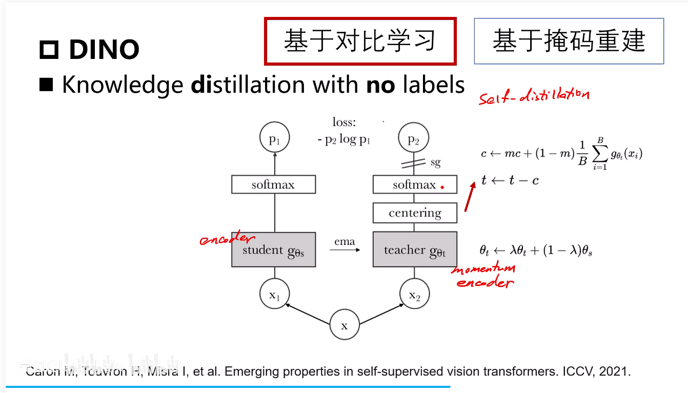 这里的center是一个可学习的参数,它通过一个动量项在整个训练过程中更新,代表所有Teacher网络输出特征的全局中心 ,用指数平滑一下,c可以看作是全局特征的中心,每次输入一张图像进入teacher网络的这个特征减掉这个c