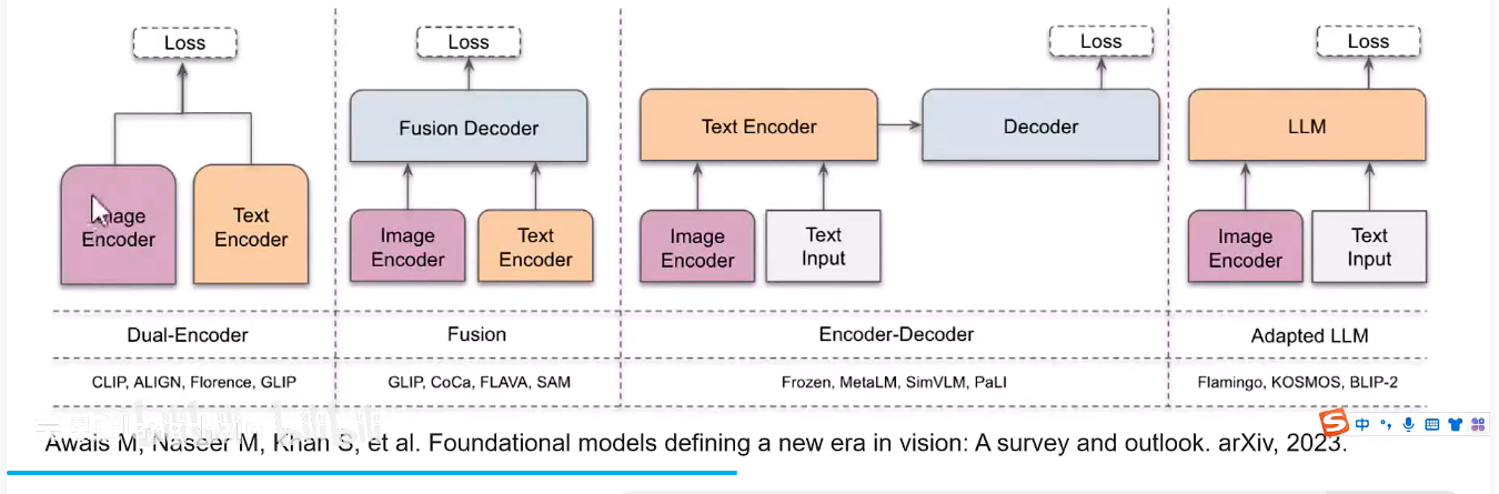 Encoder-Decoder+Adapted-LLM:两种架构方式差不多,可以看作是通过大语言模型来架构这个多模态。