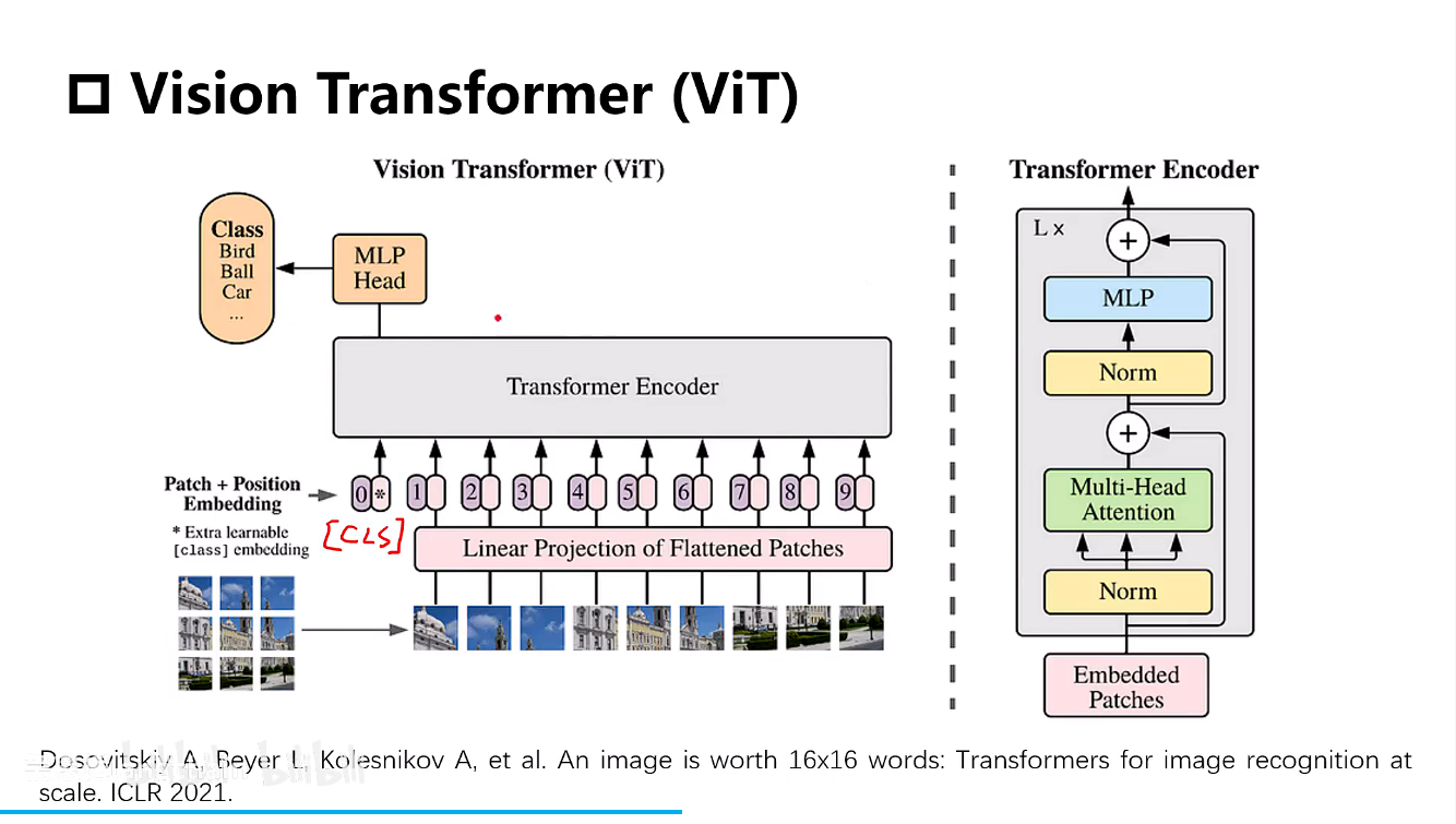 说白了就是将图片转换成向量 + [class]令牌 + 位置编码 进行训练。[class]令牌的输出用作最终的表征。