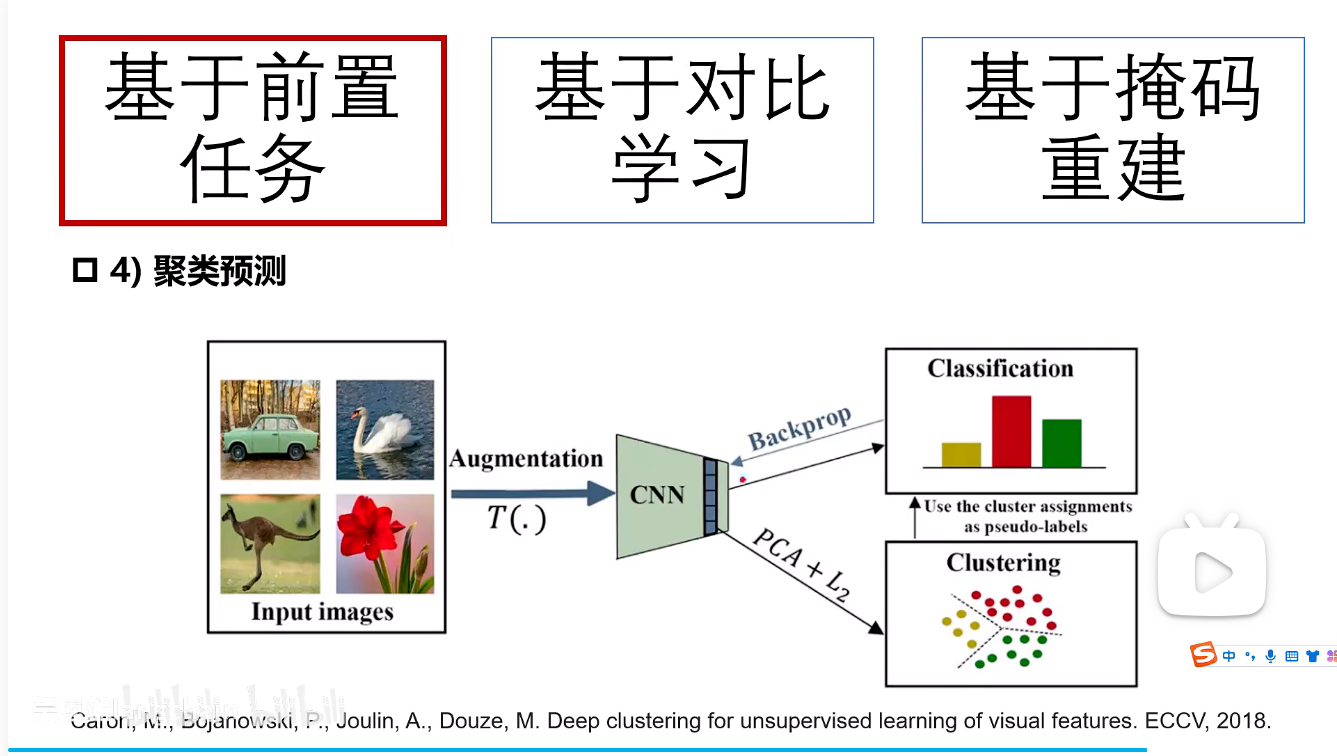 多个图片通过CNN获取特征可以进行聚类算法,给他们预测分类标签,则认为他的标签就是预测的标签,则之后就用这个标签进行反向传播去优化。(类似于半监督学习)