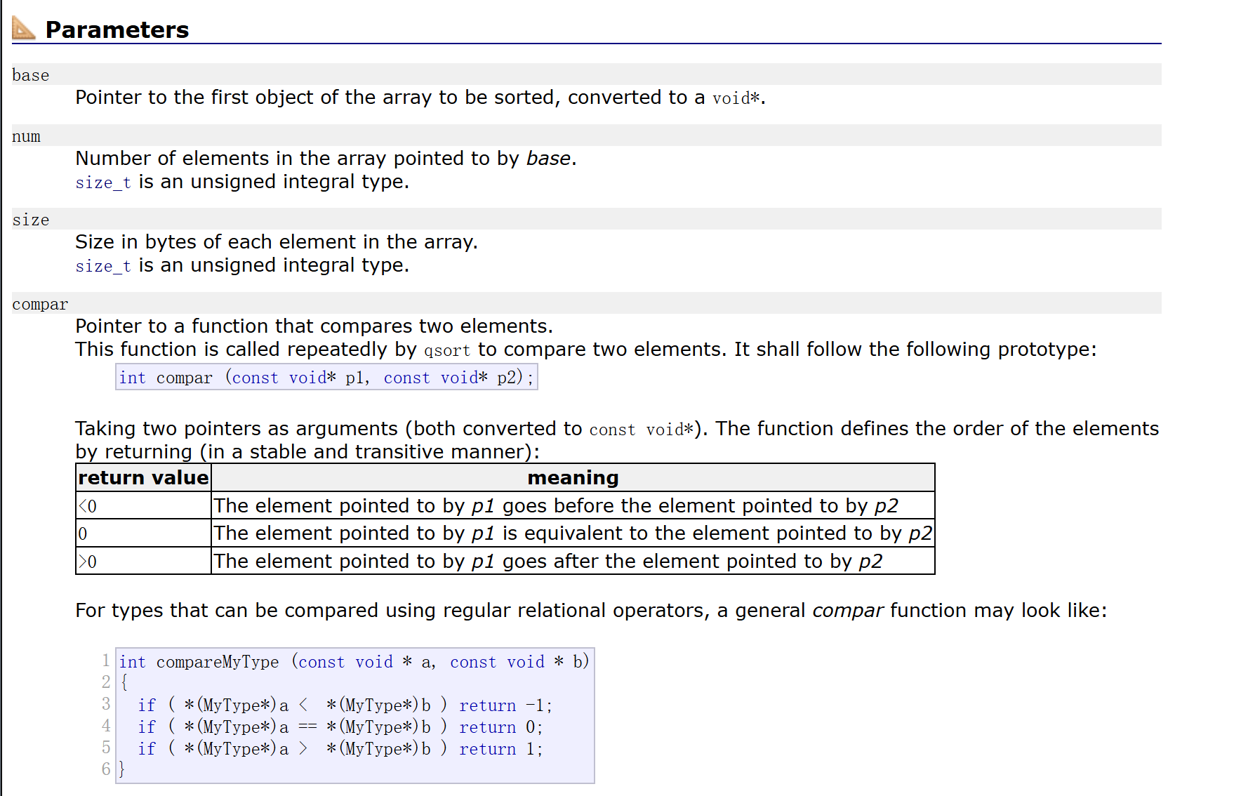 int(*compar)(const void*, const void*)//函数指针------指向的就是两个元素的比较函数