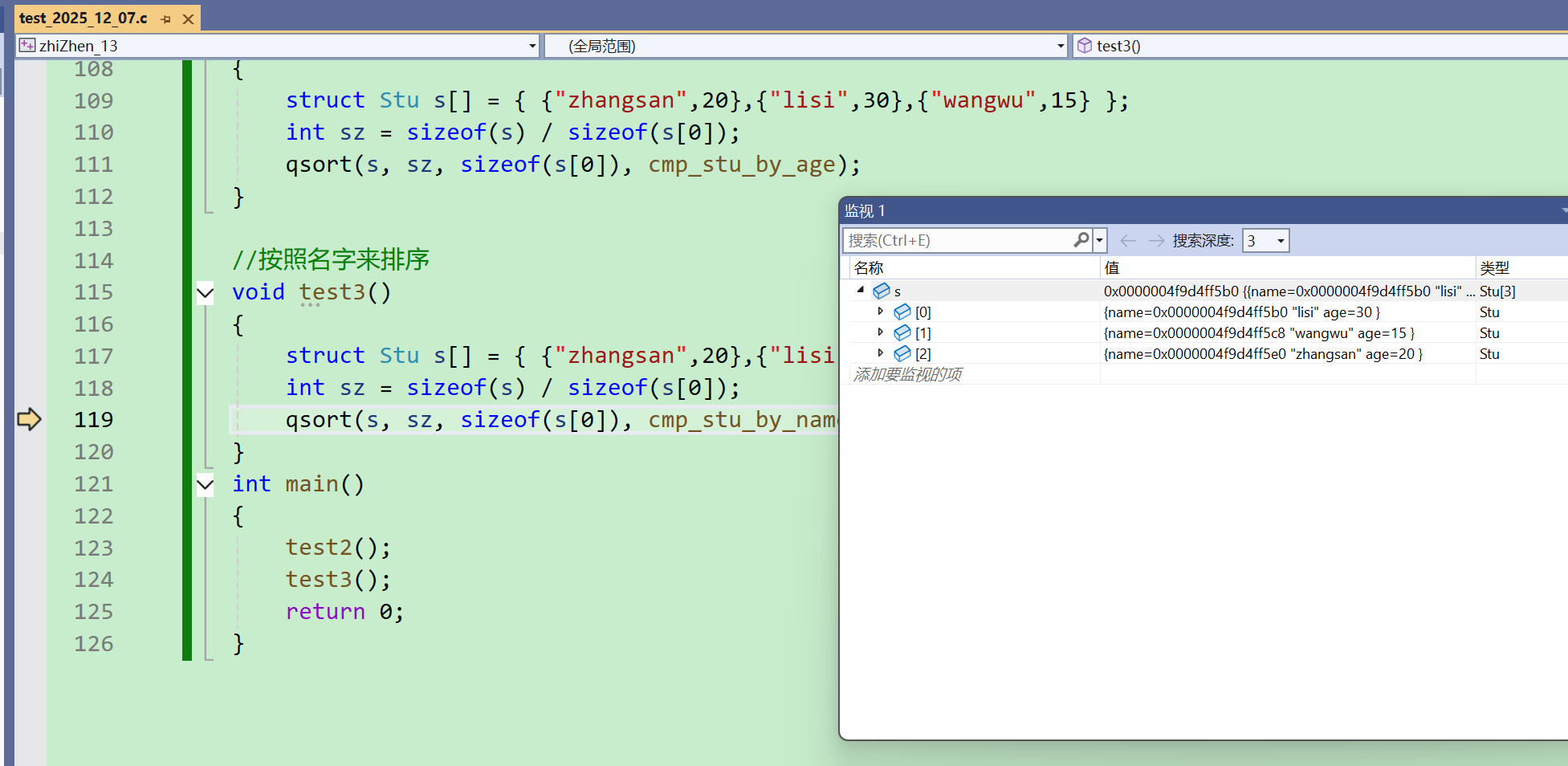 struct Stu s[] = { {"zhangsan",20},{"lisi",30},{"wangwu",15} };