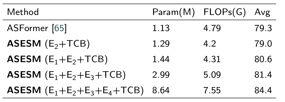 - 只使用Encoder2+TCBEncoder_2+TCBEncoder2+TCB的ASESM模型性能略低于ASFormer模型