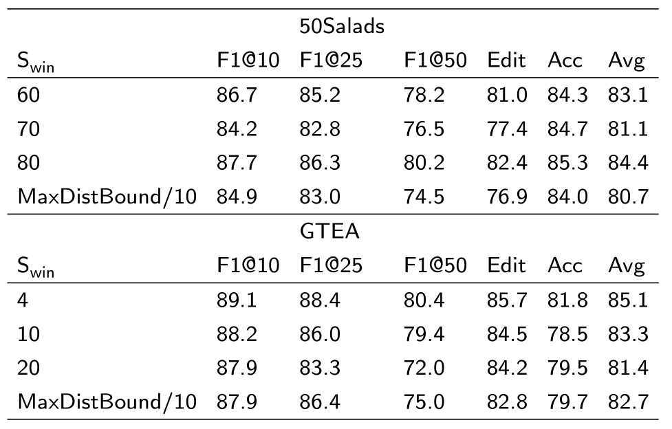 - 在50Salads数据集上,Swin=80S_{win}=80Swin=80取得了最好的效果,将窗口增大与减小均会降低性能