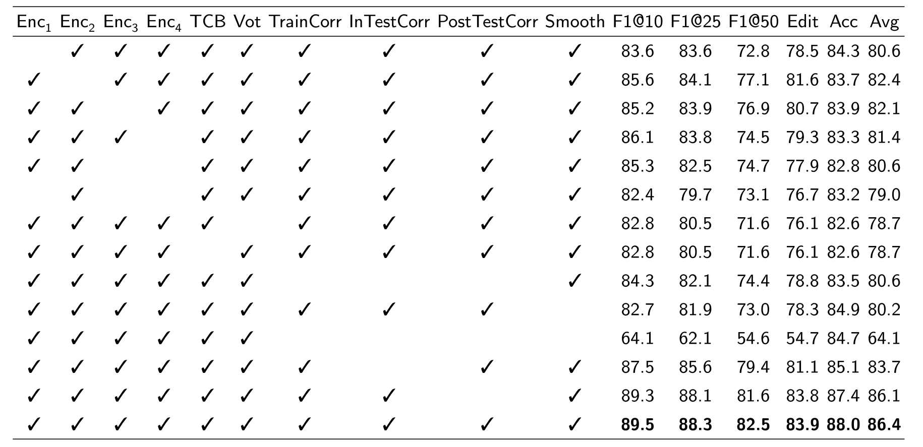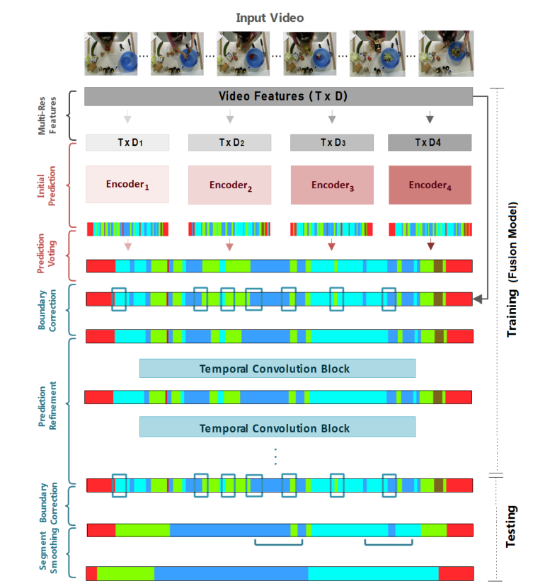 测试阶段: 后处理 融合阶段: 加载预训练编码器 训练阶段: 单独训练四个编码器 段平滑 (Segment Smoothing) 可选边界修正 最终帧级预测输出 投票融合 (Voting Fusion) 生成每帧预测 边界修正 (Boundary Correction) 多次迭代精炼 (TCB) 融合后的帧级预测 投票 (Voting) 逐帧预测 边界修正 (Boundary Correction) 更新编码器参数